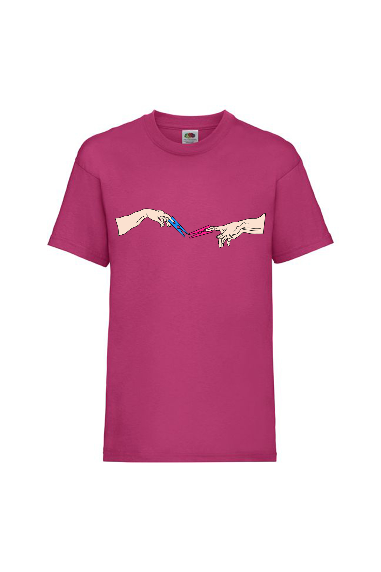 T-shirt con la reinterpretazione ironica e moderna del celebre affresco “La Creazione di Adamo” di Michelangelo, con mollette da bucato al posto del tocco divino.